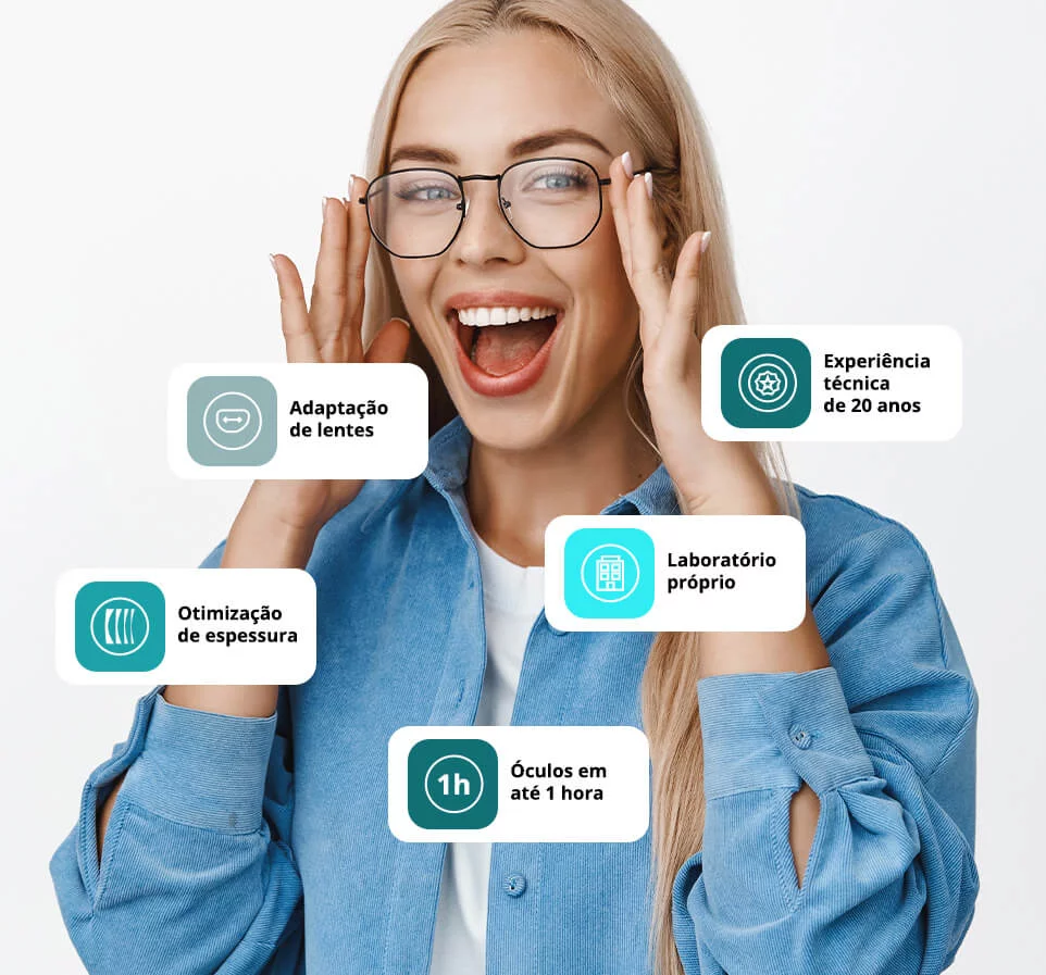 Imagine só: podemos entregar seus óculos em apenas uma hora! Além disso, conseguimos reduzir significativamente o prazo de fabricação das lentes e realizar uma variedade de serviços, tudo tendo o tempo como fator primordial para a sua comodidade.
